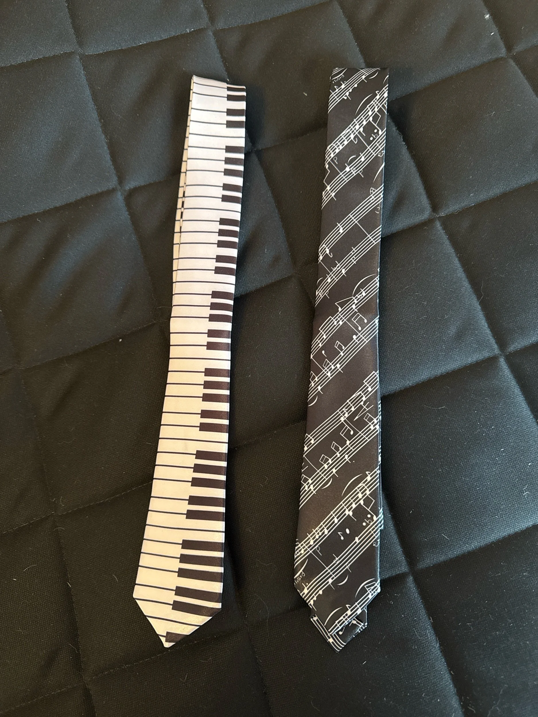 Shop › Music skinny neck ties Image 1 of 1 Music skinny neck ties $4.99 Pattern: Piano keys Music staff Quantity: Add To Cart Added!